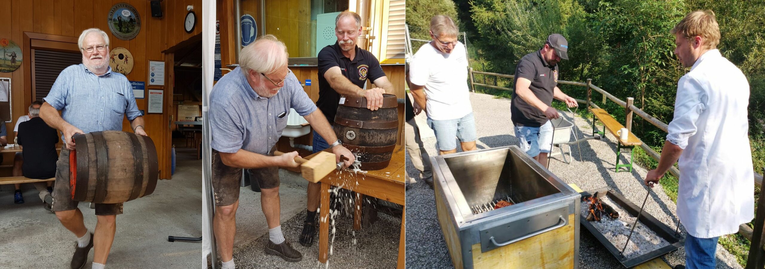Als die kleine Seglerabordnung eintrifft, da sind zwar einige gezielte Treffer an den Schießständen schon verpasst, aber das Augustinerbräu wird erst gezapft und in der Kiste darf das Schweinefleisch noch etwas garen. Wie fit unser Jubilar noch ist, das demonstriert er gleich locker mittels vollem Bierfaß. Schurzfrei bleibt er auch beim Zapfen trocken – es gibt praktisch kaum verspritzten Gerstensaft.