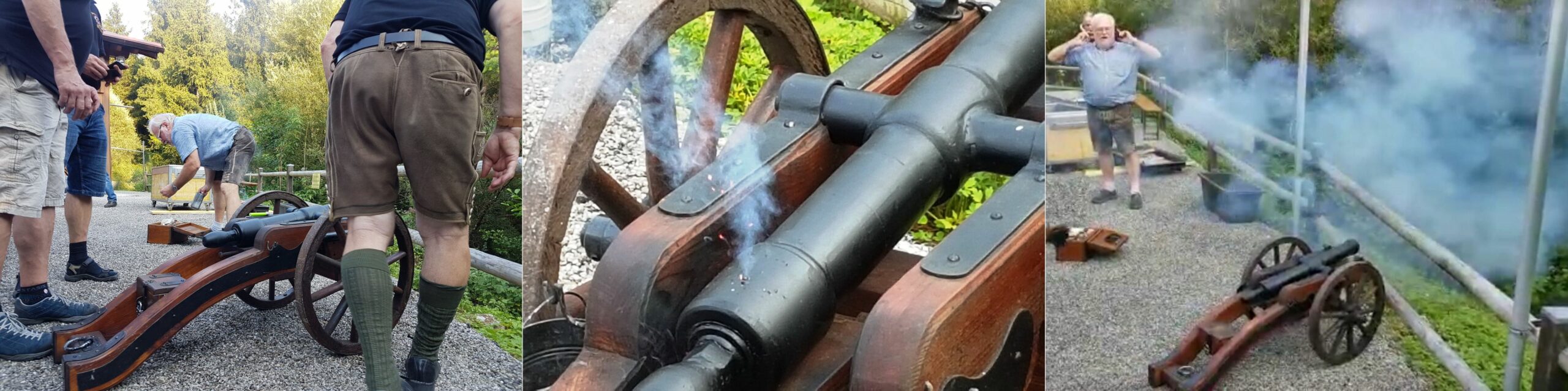 Der Beschuss der Geburtstagsscheibe ist zwischenzeitlich abgeschlossen, aber die Auswertung braucht noch etwas Zeit. Da kommt nun ein Kanonensalut für den Jubilar als Programmpunkt gerade richtig. Akribisch fachmännisch stopfen die Experten das Rohr, die Lunte brennt, der Knall folgt Ohren betäubend und der Schwarzpulverrauch vernebelt Wald und Georg.