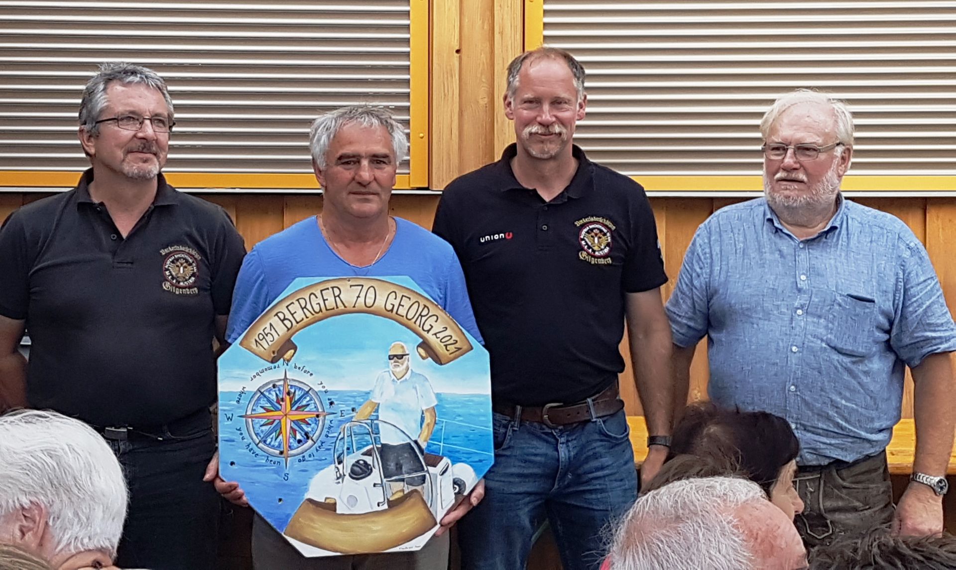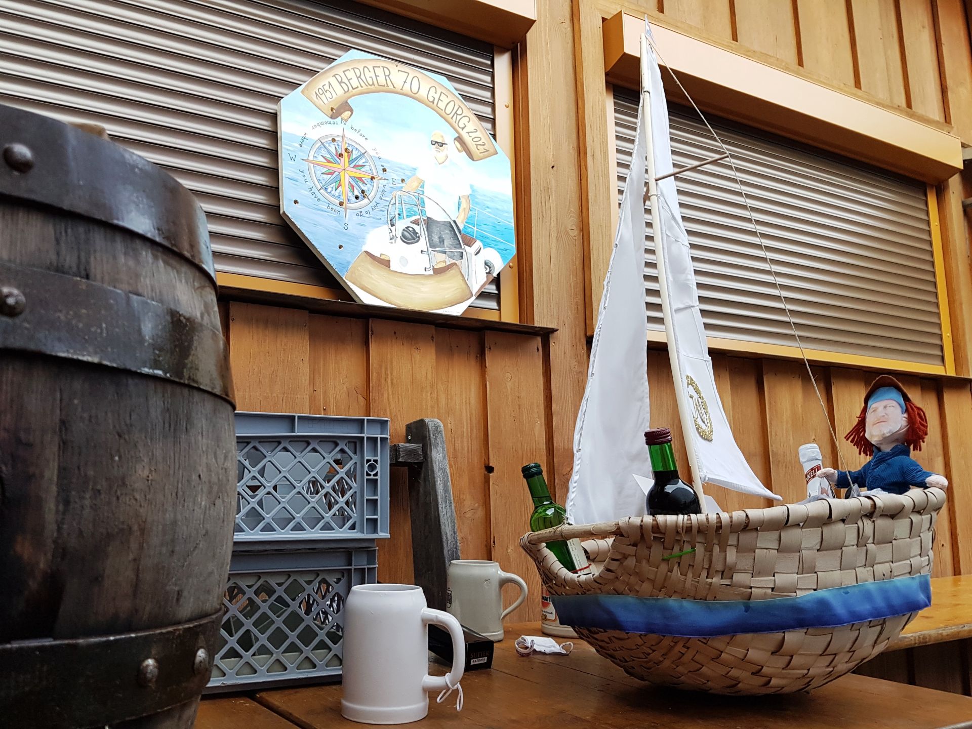 Ein wenig Ansprache und Würdigung gibt es natürlich auch und am Tisch hat Georg zahlreiche Preise für die besten Scheibenschützen aufgestellt. Selber hat er sich diesmal vornehm zurückgehalten. Zudem ist er recht froh, dass alle auf die Kompassrose zielten und keiner dem stolzen Skipper mit der dunklen Brille eine auf den Pelz brannte. Rudi Angerer ist heute der glückliche Sieger und er darf deshalb auch die fesche Geburtstagsscheibe mit dem maritimen Ziel halten.