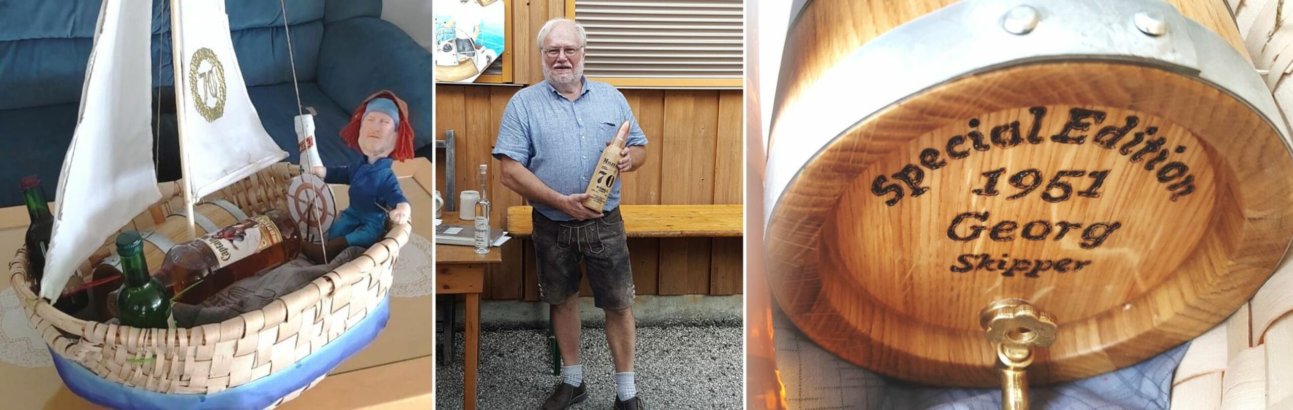 Zum Gratulieren haben die Gäste auch ein paar Geschenke mitgebracht und diese wandern nun zum Jubilar. Für die Segelabteilung haben sich Annemarie und Ferdinand eigens schiffsbauliche Fähigkeiten angeeignet. Die Vorgabe war es, ein gemütliches Boot für einen Pensionisten zu entwickeln. Das Ergebnis kann sich sehen lassen. Thor Hayerdahl könnte vor Neid erblassen.