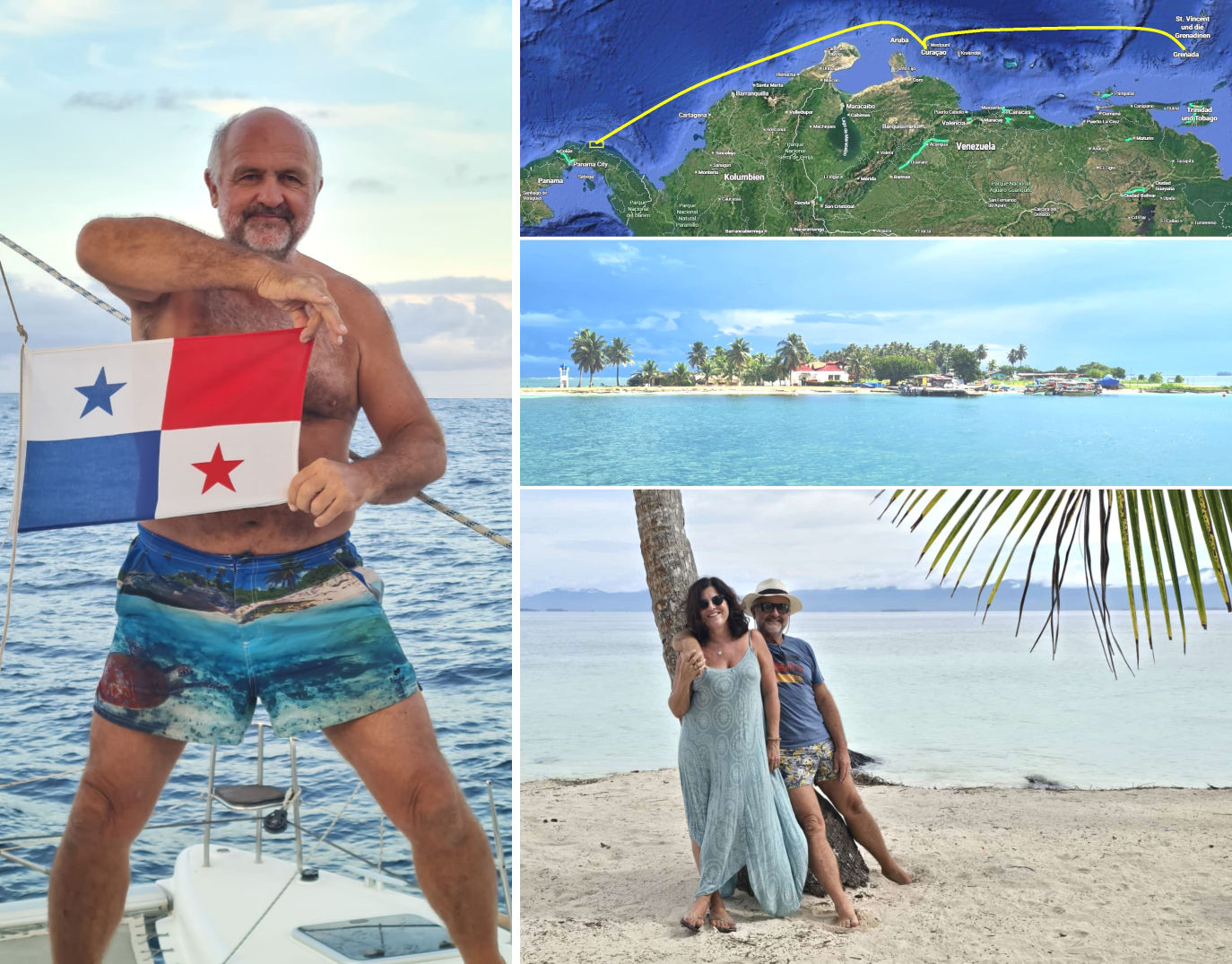 Nach meilenstarken zwei Etappen, erst von Grenada zu den ABC-Inseln und dann, nördlich von Venezuela und Kolumbien, weiter bis zum Eilandgewirr von San Blas, das als autonomes Gebiet vor der karibikseitigen Küste Panamas liegt, ist die EL GRECO IV gut auf einem der 365 Palmenhaine angelandet. YCBS-Vize Felix (sein Bild erinnert mich an jemand) präsentiert stolz die Gastlandflagge und meint dazu: Life is better at the (palm) beach … ! Nun ist der Panamakanal nicht mehr weit, aber der kommt später.