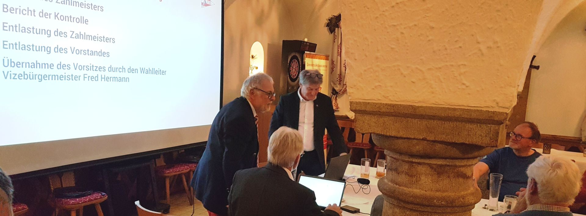 Die zahlreich erhobenen Hände brachten eine klare Entscheidung (ohne Gegenstimmen und Stimmenthaltungen) für den neuen Vorstand und Fred Hermann konnte dem neuen alten Commodore Christian Haidinger und seinem frisch gewählten Team herzlich gratulieren (Vergrößerung der illustren Runde durch Klick in den Kasten). Schön ist es, dass sich unter die alten Haudegen auch schon einige junge Gesichter gemischt haben. Noch schöner wäre es, wenn sich in Zukunft auch wieder einmal etwas Weiblichkeit hineinschummeln könnte.