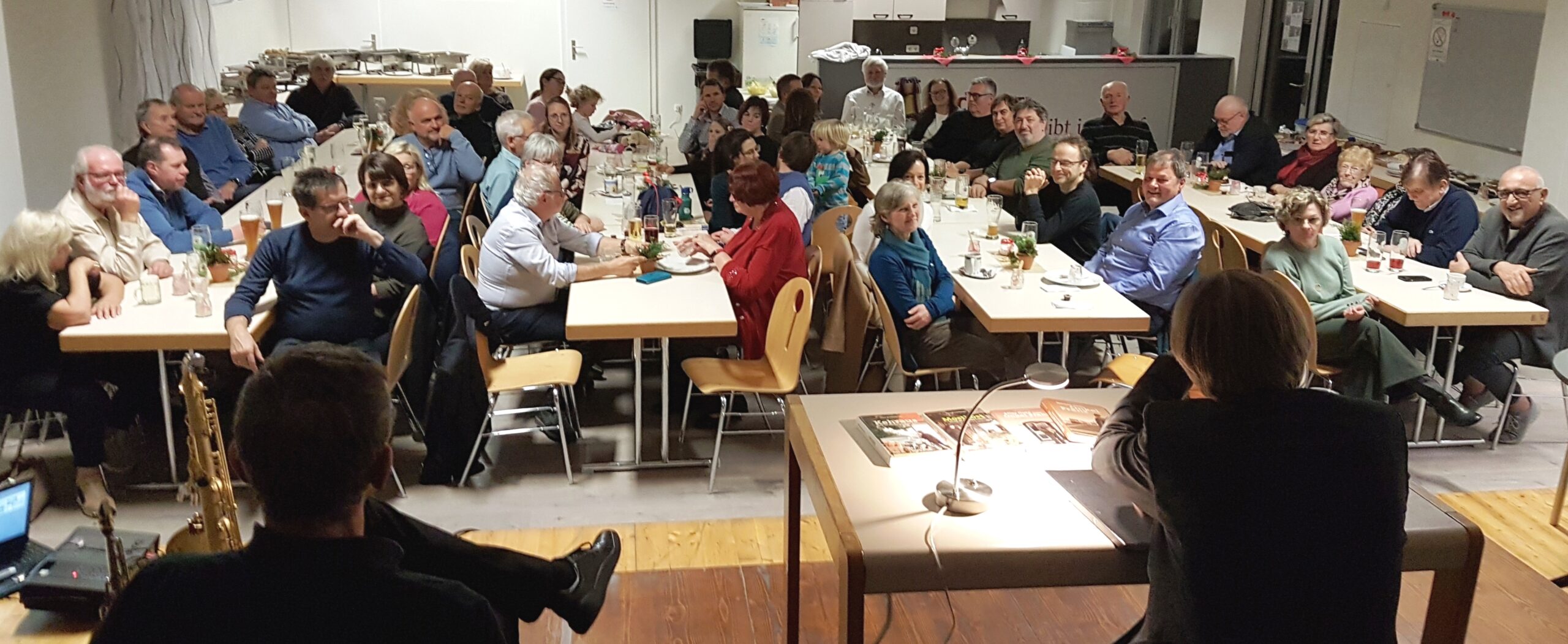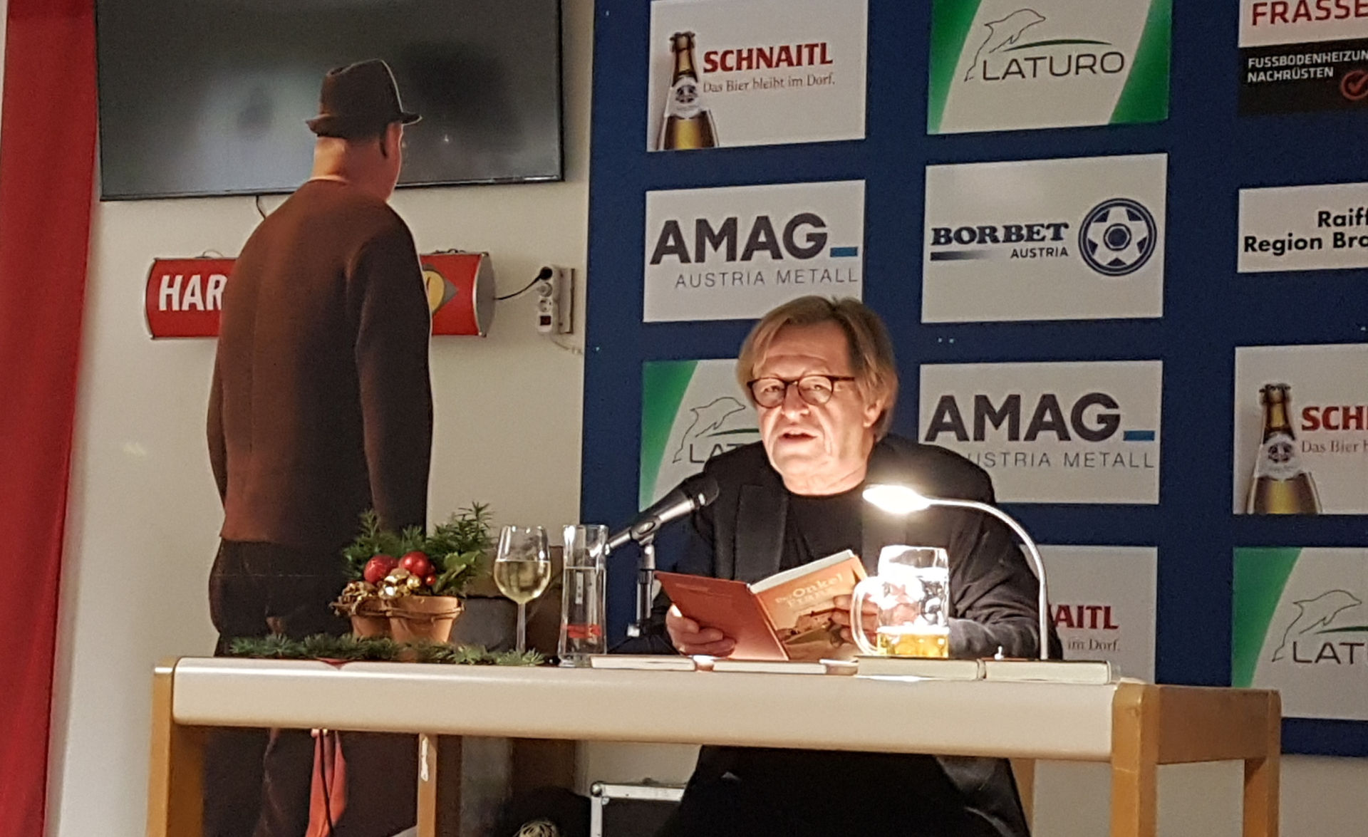 Ein sehr guter Sättigungszustand im Magen ist ja nicht gerade die beste Voraussetzung für eine Lese-Einschaltung, aber das Programm sah es nun mal so vor. Für den vorweihnachtlichen Abend hatte der Braunauer Frisörmeister Klaus Ranzenberger seinen Onkel Franz als Pappkameraden (der uns immer nur den schönen Rücken zeigte) und die dazugehörigen Bücher mitgebracht. Die nun folgende Auswahl an lustigen, spitzbübischen oder auch satirischen Geschichten, manchmal etwas vorweihnachtlich mit Glühwein angehaucht, ließen einfach keinen Schlaf aufkommen.