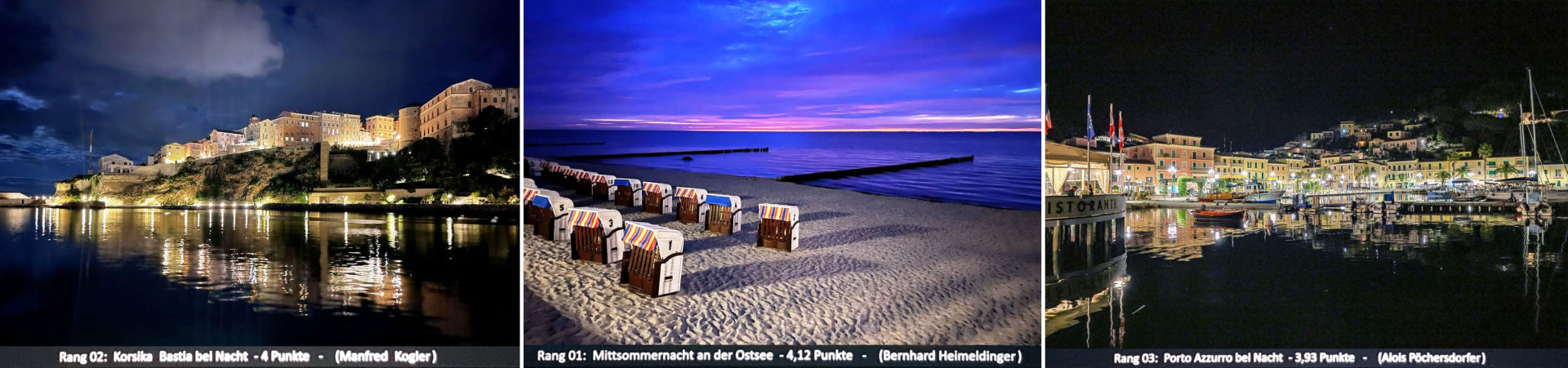 Diesmal hatten es die nächtlichen Aufnahmen den Bewertern angetan. Auch die Plätze 2 und 3 stammen aus dem lichtscheuen Milieu. Manfred Kogler belegte mit „Korsika – Bastia bei Nacht“ Rang 2 und Alois Pöchersdorfer mit „Porto Azzurro bei Nacht“ Rang 3.