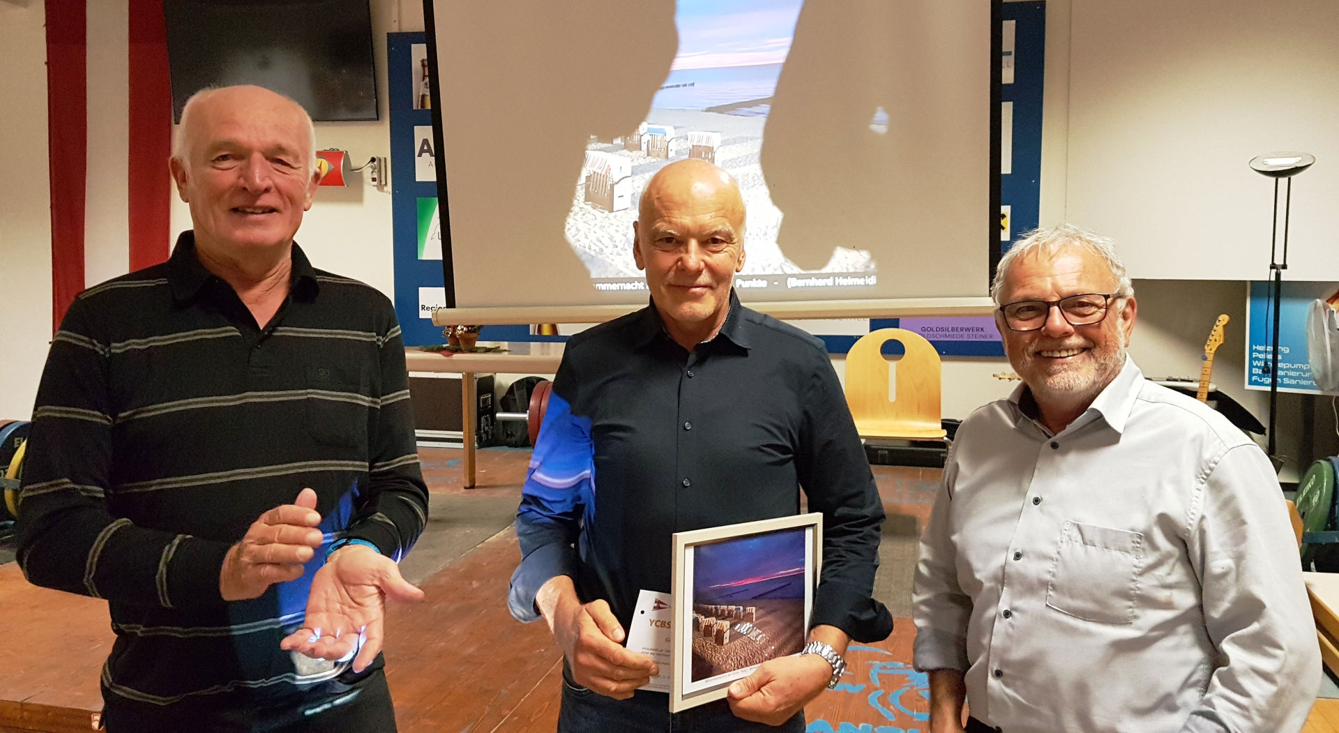 Für einen weiteren abendlichen Einschub sorgte Ferdinand Brandstätter mit dem Abschluss des YCBS-Fotowettbewerbes 2025. Dazu präsentierte er nun die eingereichten und bereits bewerteten Bilder (64 Aufnahmen von 22 Mitgliedern) vorerst in beliebiger Reihenfolge, ab den 20 besten aber in spannungsfördernder Countdown-Sequenz. Die besten 3 Motive gabs wiederum ausgedruckt und eingerahmt, wobei die Gewinner der Plätze 2 und 3 leider nicht anwesend waren. Aber der Sieger war da und mit ihm freuten sich Ferdinand und Christian beim gemeinsamen Kamera-Lächeln.