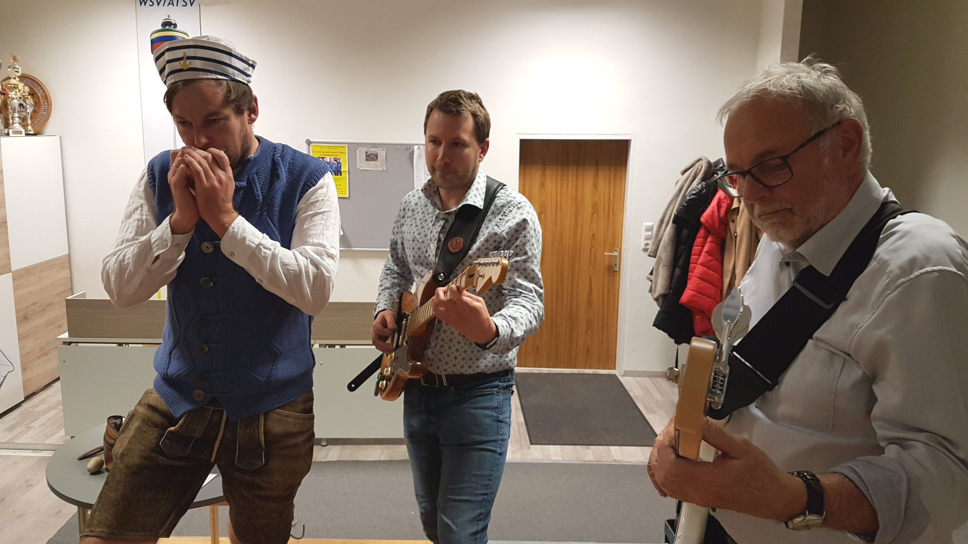Für einen letzten musikalischen Gruß hinüber ins Jenseits sorgten instrumental Michael, Christian und Jürgen, während sich gesanglich die anwesenden Clubfreunde beteiligten – den Liedtext dazu strahlte der Beamer auf die Leinwand.