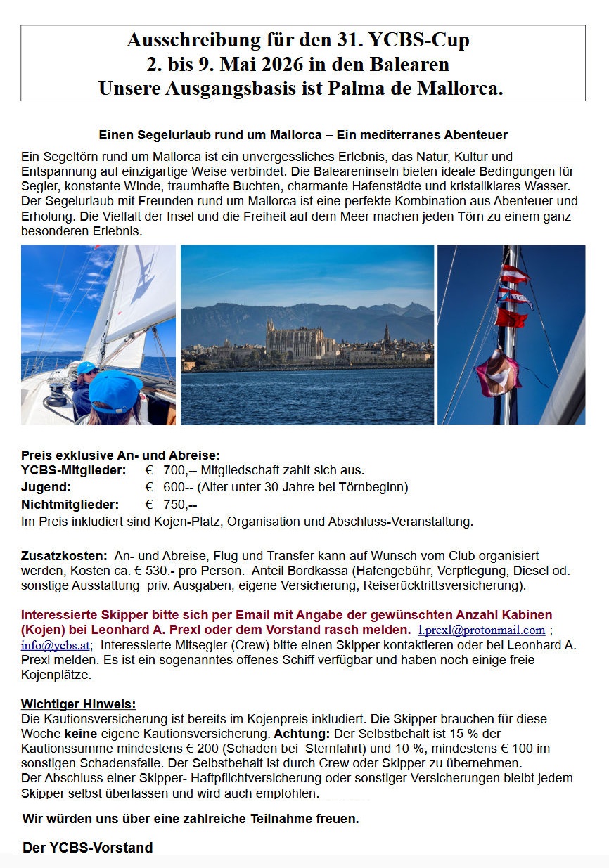 Wie ihr vielleicht in obiger Mailaussendung gelesen habt, gibt es nach mehrfachem Wunsch beim YCBS-Cup 2026 vor Mallorca ein offenes Schiff.