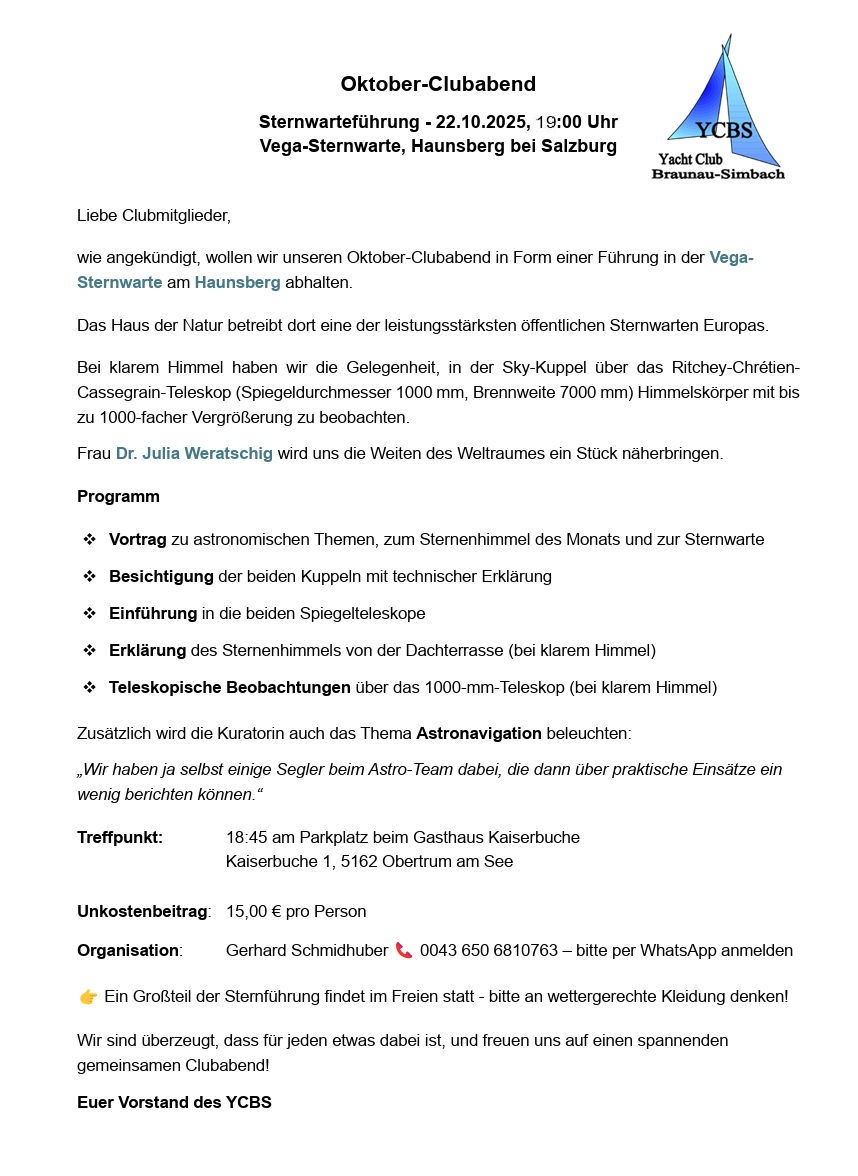 Ganz so hell wie am Bild wird es dann wohl nicht mehr sein. Macht nichts – wir haben da oben ja hoffentlich viele Lichter am Himmel. Freuen wir uns also auf einen Auswärts-Clubabend mit grandiosem Sternenhimmel !